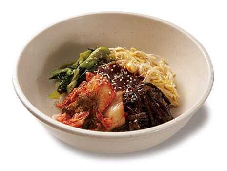 在米饭上放上韩式拌菜,肉,韩国红辣椒酱,鸡蛋等的韩国料理。