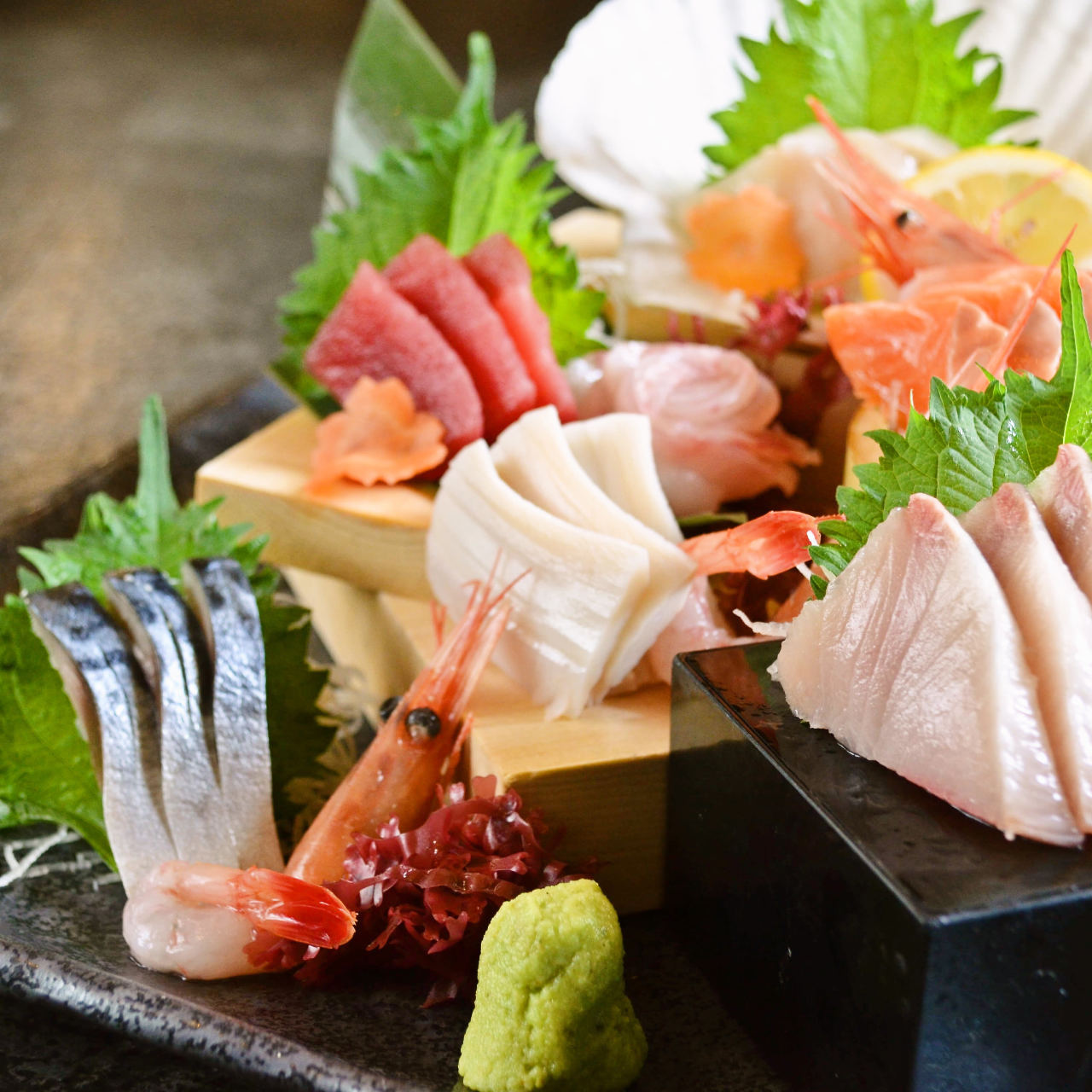 多种海鲜刺身的拼盘料理。