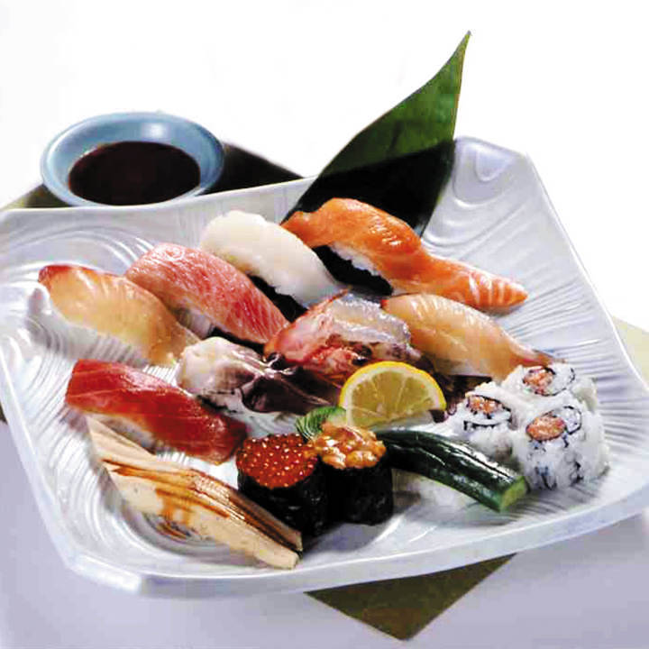 寿司醋饭上放上一口大小的海鲜类,鱼卵,煎蛋卷等做成的寿司料理。