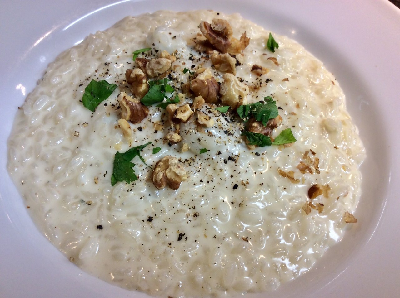 在用黄油炒好的米中放入葡萄酒和高汤炖煮后再混合奶酪的料理。