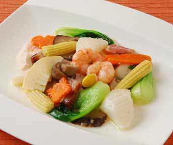 将海鲜类和蔬菜用油炒制,加入面条再用调味料调味,一同拼盘的料理。