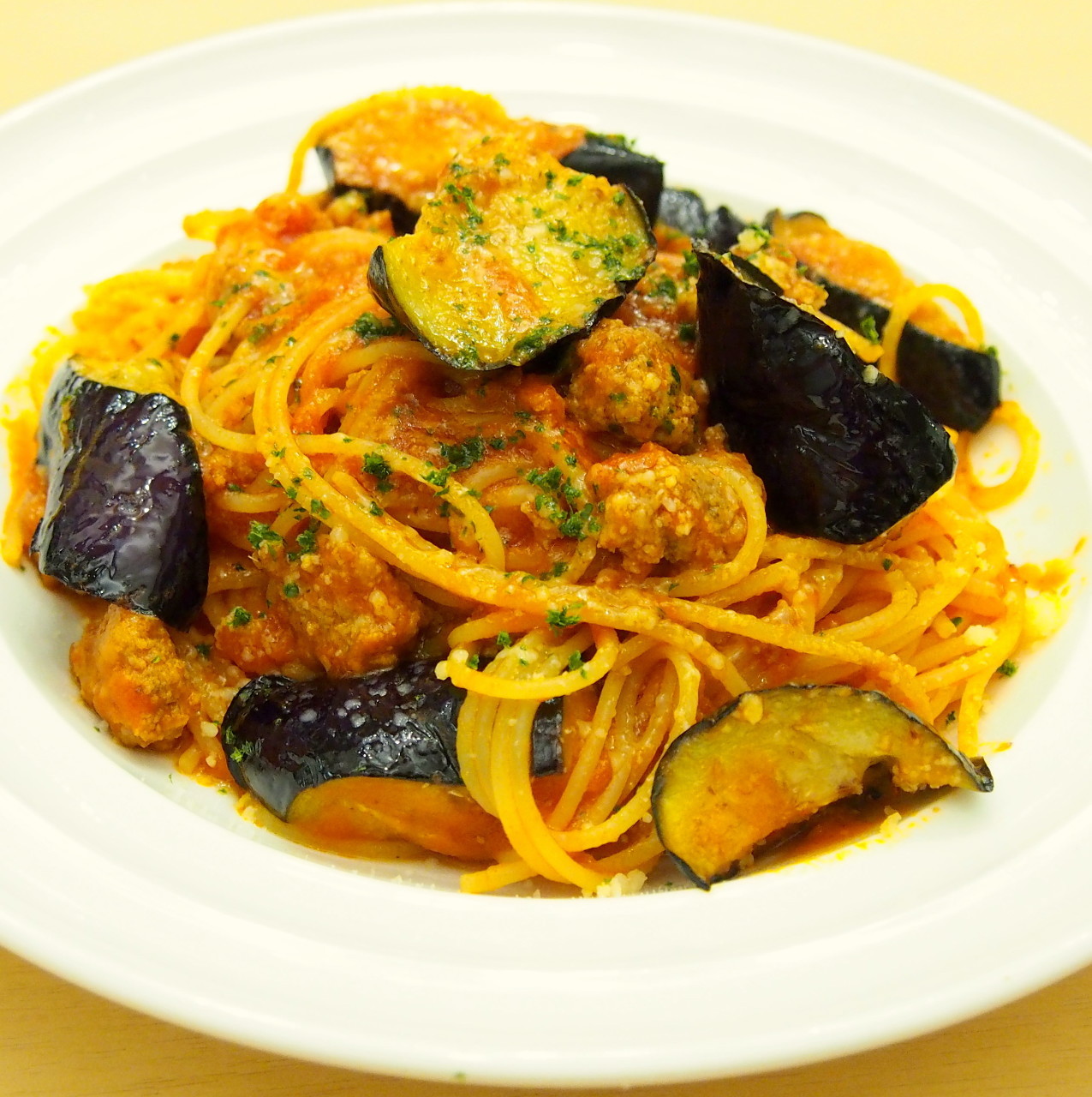 自家製サルシッチャと茄子のピリ辛トマトソース スパゲッティ
