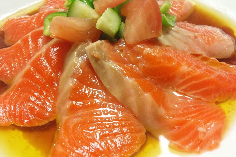 三文鱼腩, 红莴苣, 彩椒, 胡萝卜, 柠檬