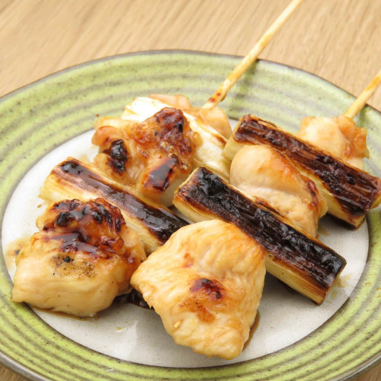 把调味后的鸡肩胸肉(肩、胸部分很少见的肉)串在竹签上用火烤。