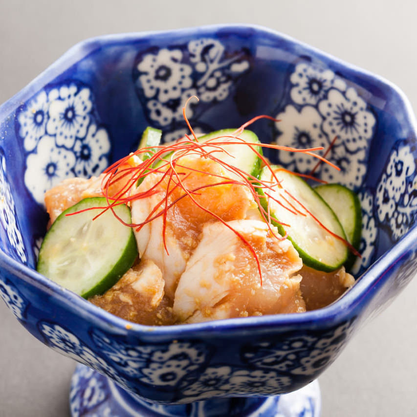 将生鸡肉或嫩煮过的鸡肉切成1cm左右的丁,用调味汁和葱姜等拌匀后,加上生蛋黄制成的料理。