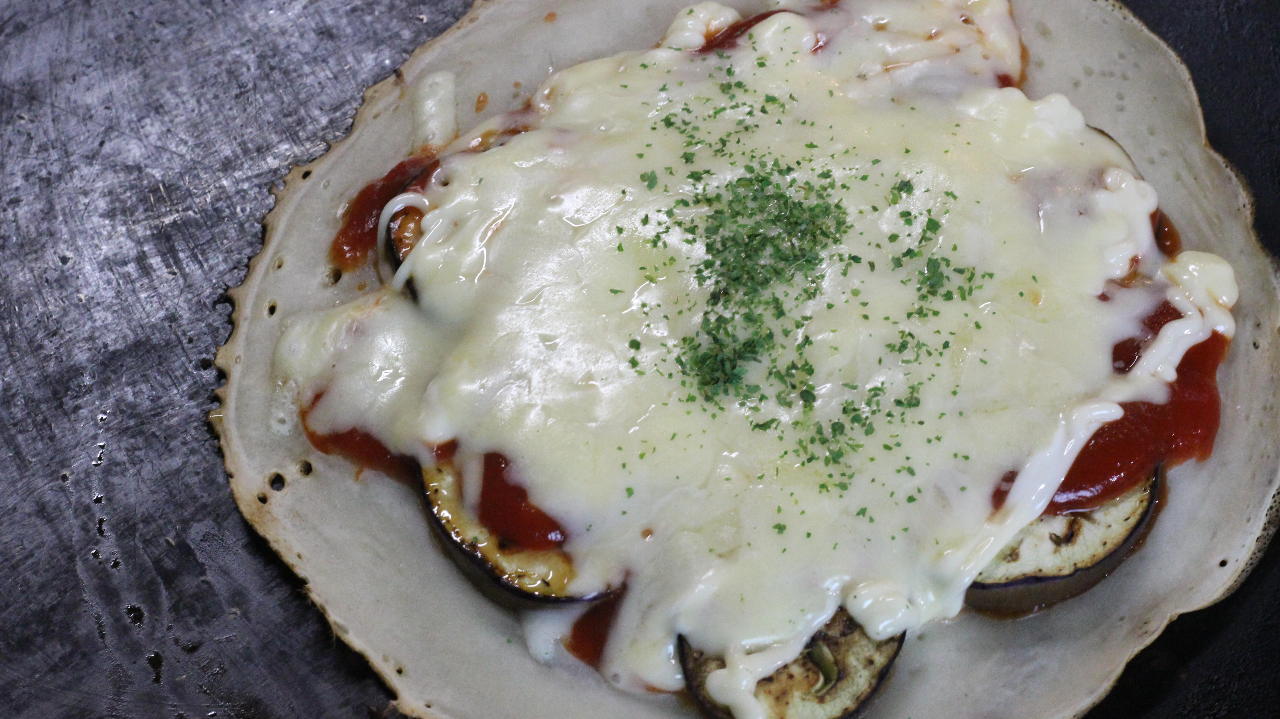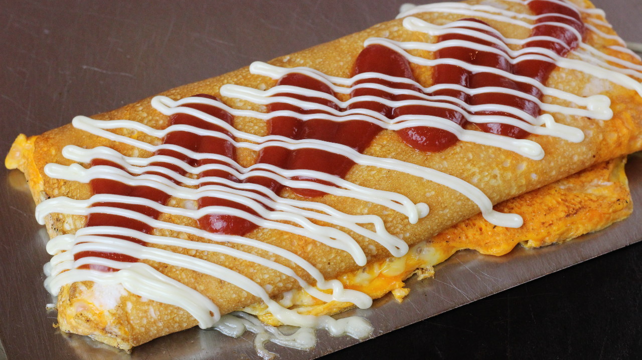 将使用小麦粉做成的薄面皮摊开,放卷心菜、乌冬面、蔬菜、海鲜、肉等煎烤而成的料理。