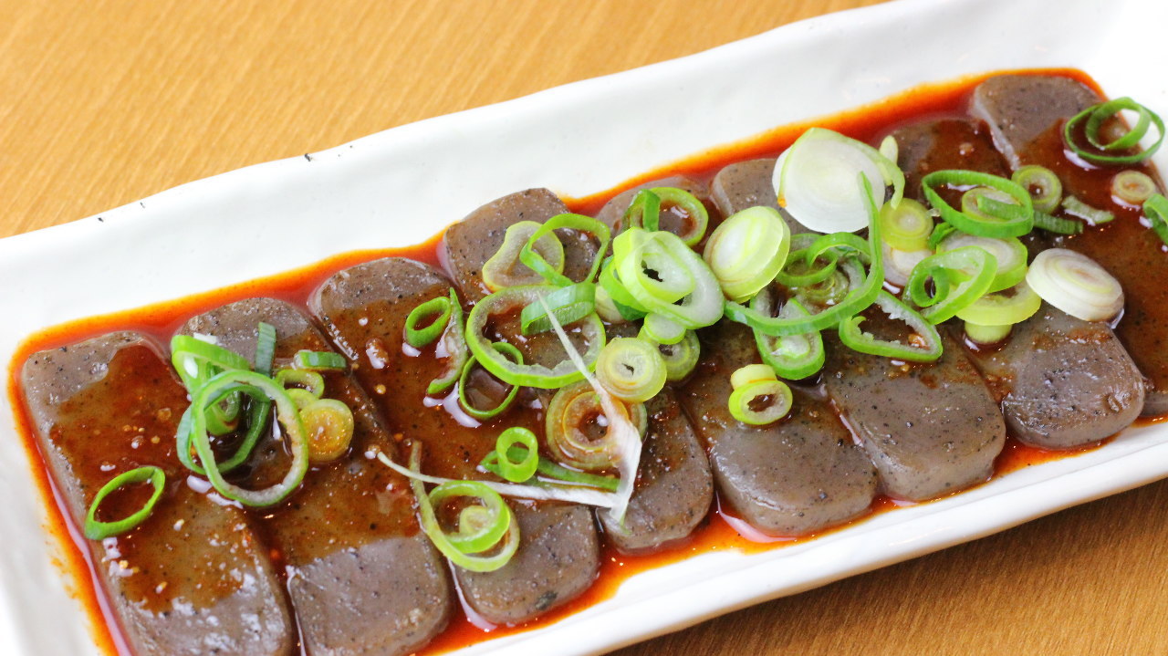 将切好的鱿鱼肉放入小麦面粉中制成面饼后煎烤,再浇上甜鲜酱汁的料理。