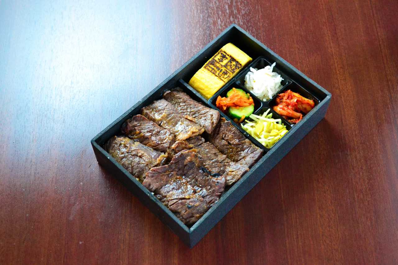 - 食材: 牛肉, 小油菜, 胡萝卜, 大蒜, 白饭, 蛋黄, 海苔, 泡菜