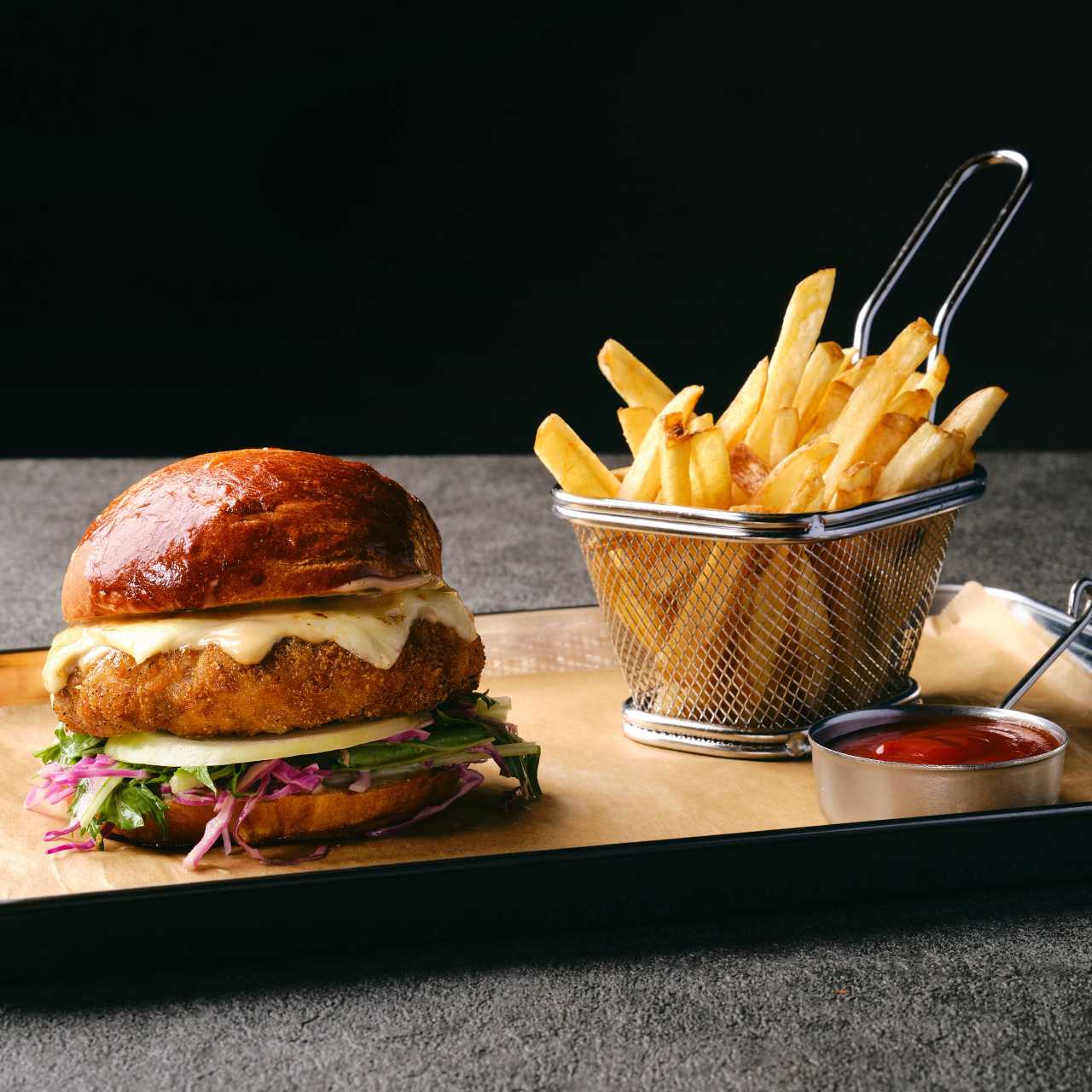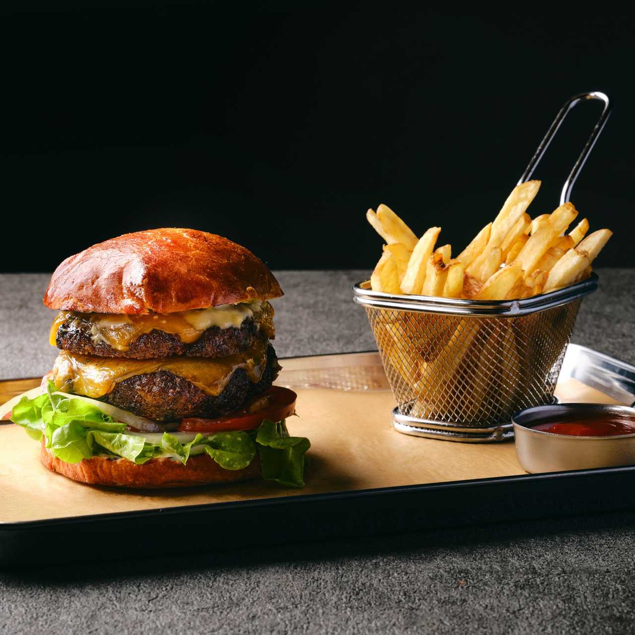 双层烤“浪速黑牛”和牛,切达奶酪,生菜,洋葱,芥末酱