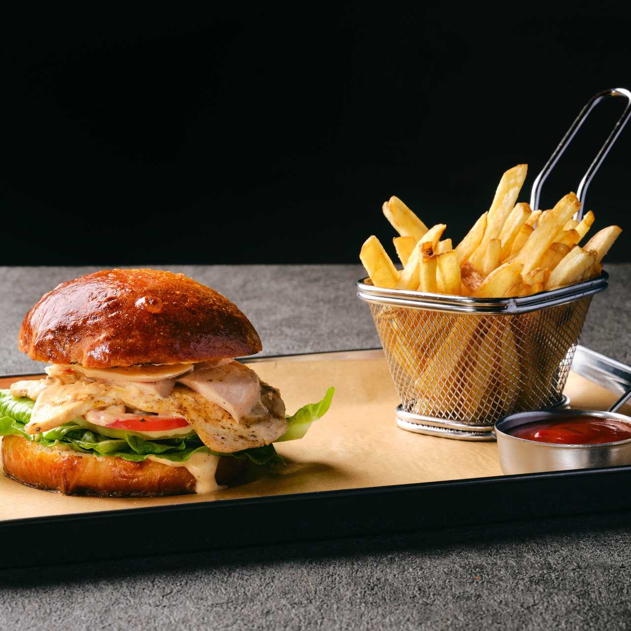 烤“浪速黑牛”和牛,生菜,洋葱,番茄,蘑菇洋葱炒,切达奶酪,芥末酱
