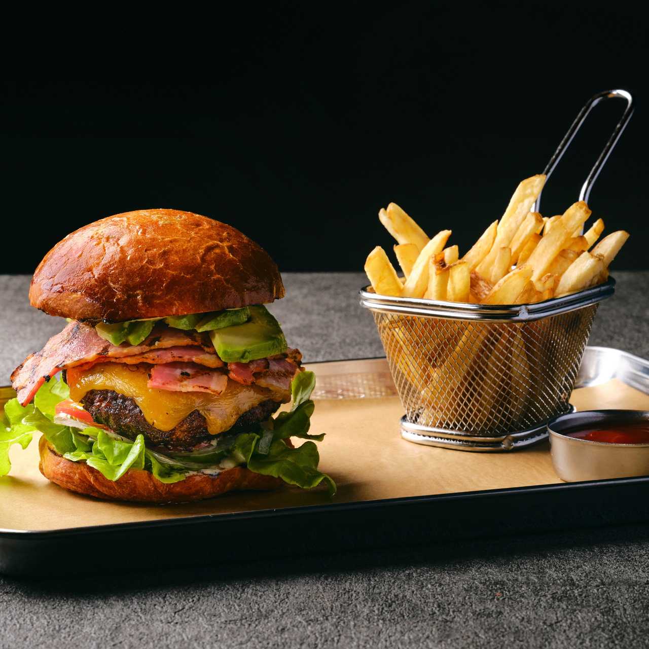 和牛, 培根, 牛油果, 莴苣, 洋葱, 番茄, 切达奶酪, 马铃薯