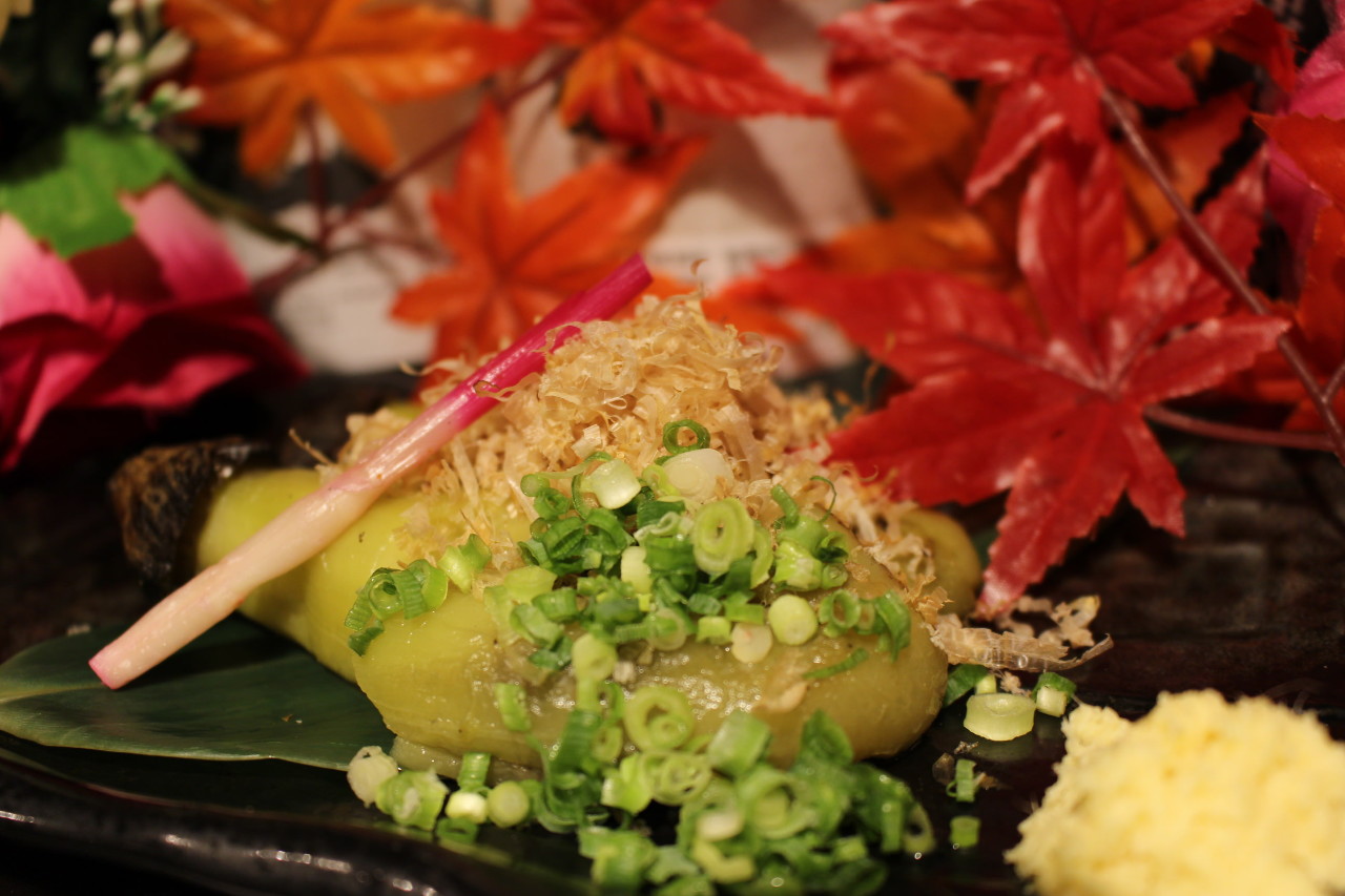 在切好并烤好的茄子上撒上柴鱼片,蘸高汤或酱油等食用的料理。