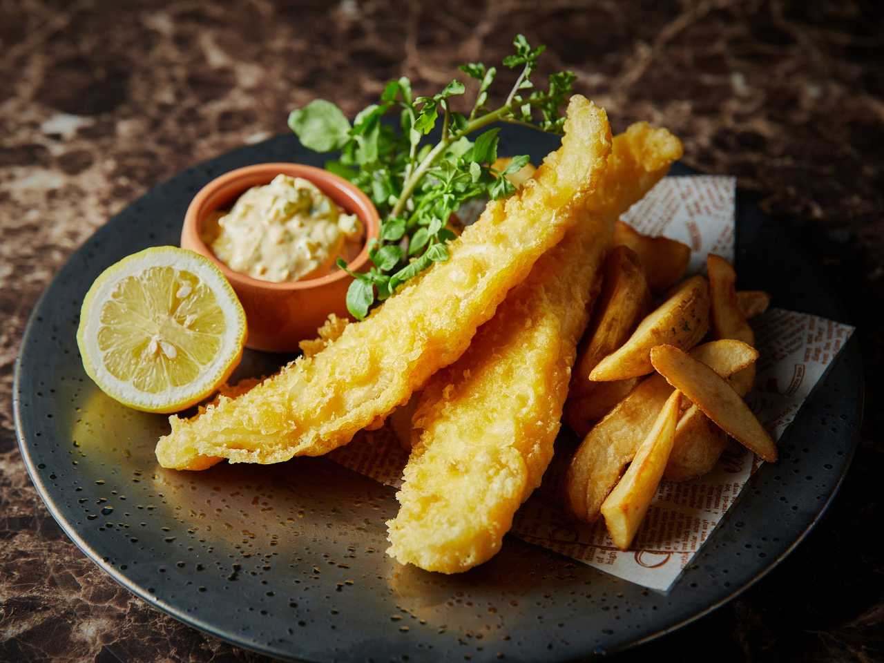 将油炸鳕鱼等白身鱼和条状的薯条放在一起的英国料理。