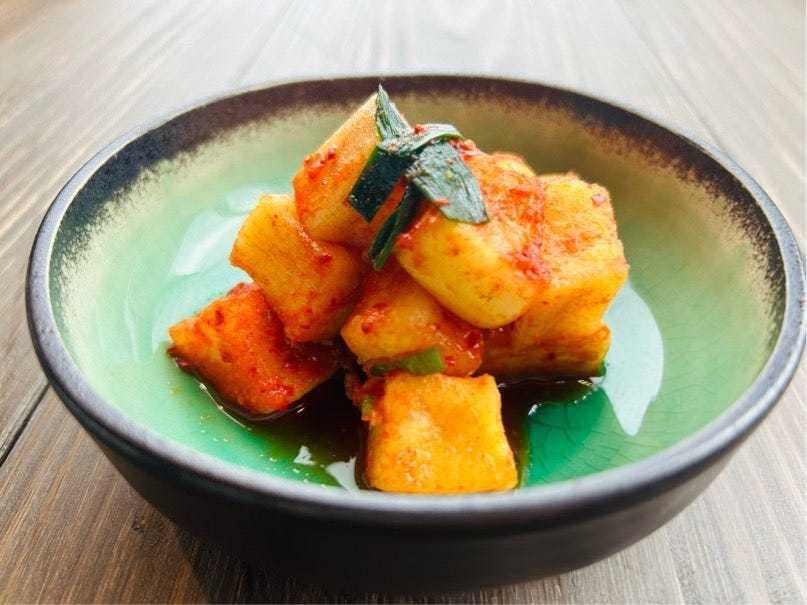 将3种蔬菜与盐,辣椒,海鲜类盐辛以及大蒜等一起腌制的拼盘料理。
