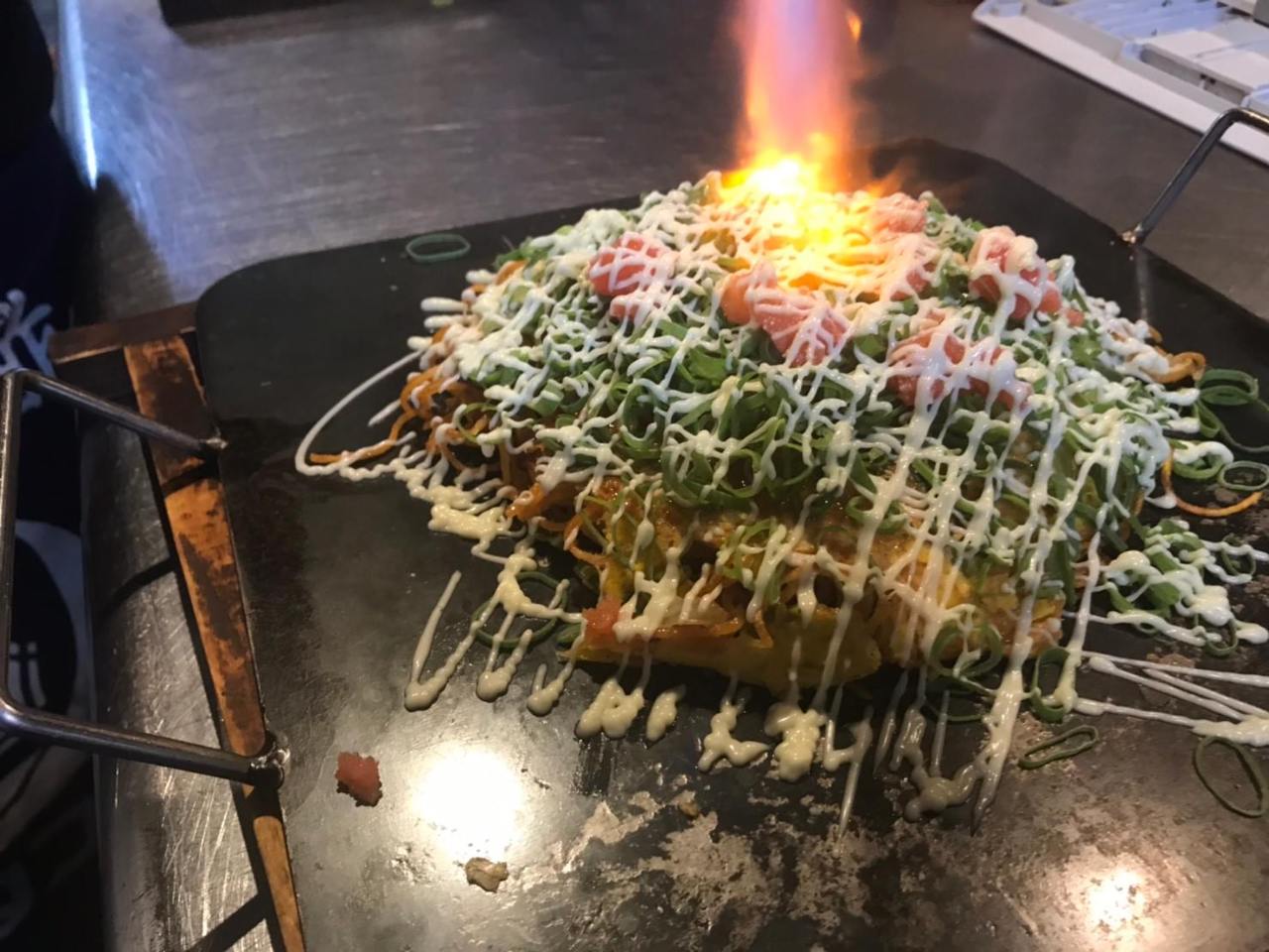 面浆中加入多种蔬菜,用铁板煎制而成。