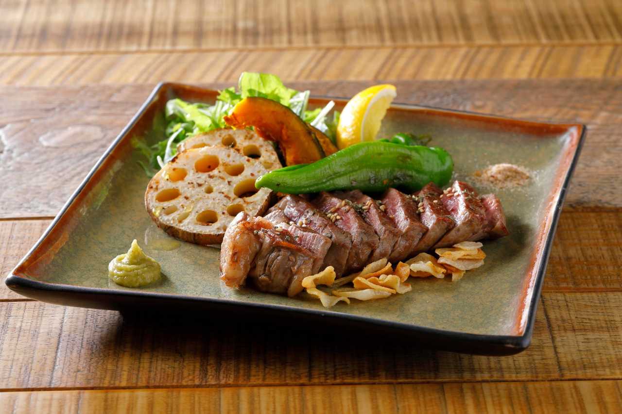 将被称作沙朗的和牛的背中心到腰部位的肉切成厚片烤制而成的料理。