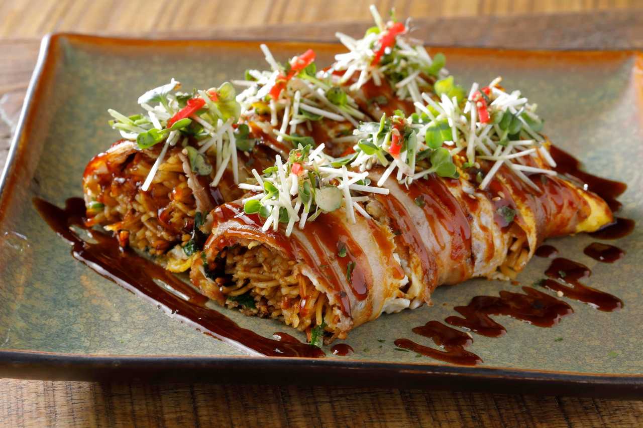 将搅拌好的蛋液煎薄后包上用炒好的鸡肉和番茄酱入味的米饭的料理。