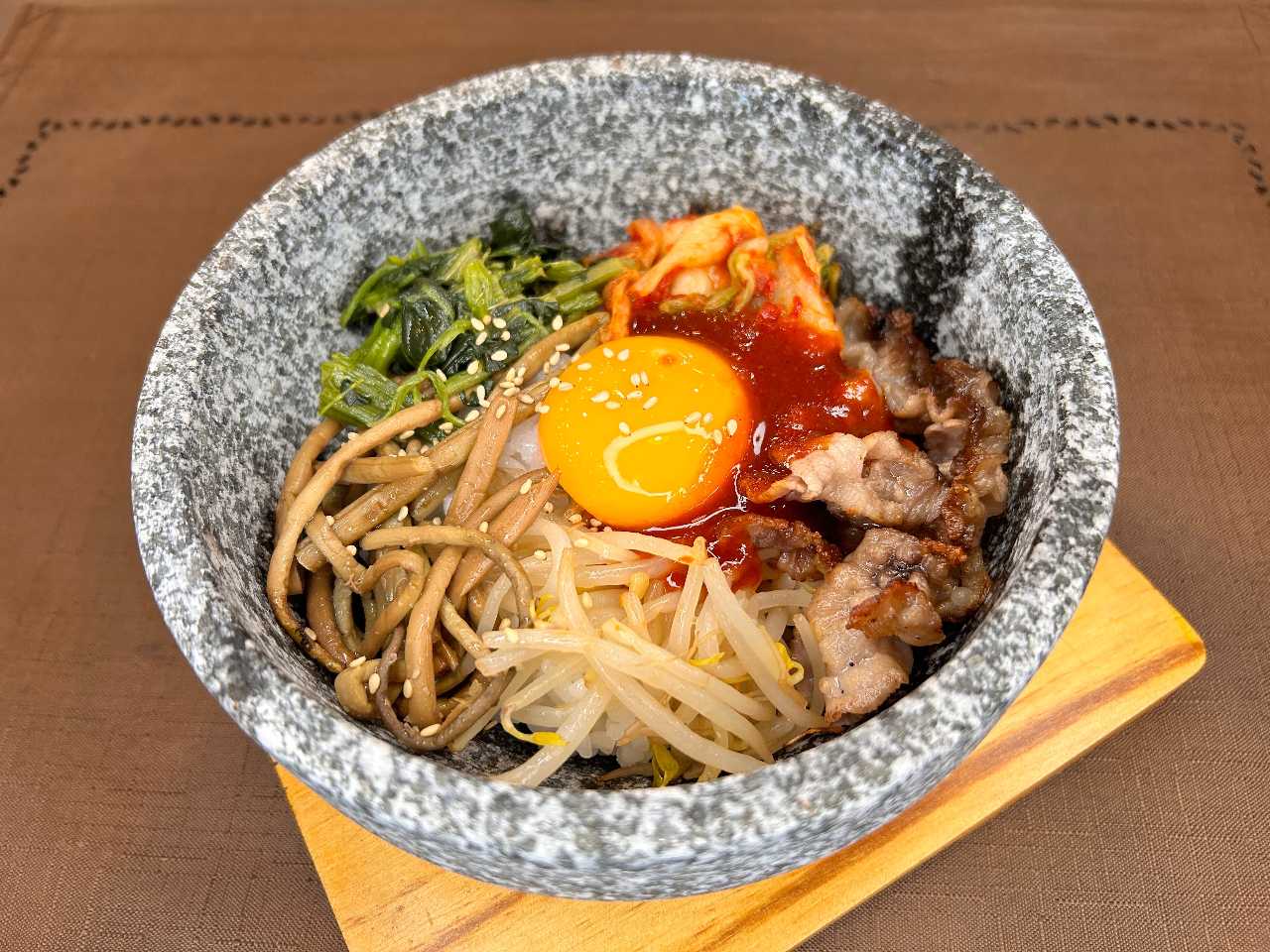 在石锅中放上米饭,韩式拌菜,肉,韩国红辣椒酱,鸡蛋等后加热的韩国料理。