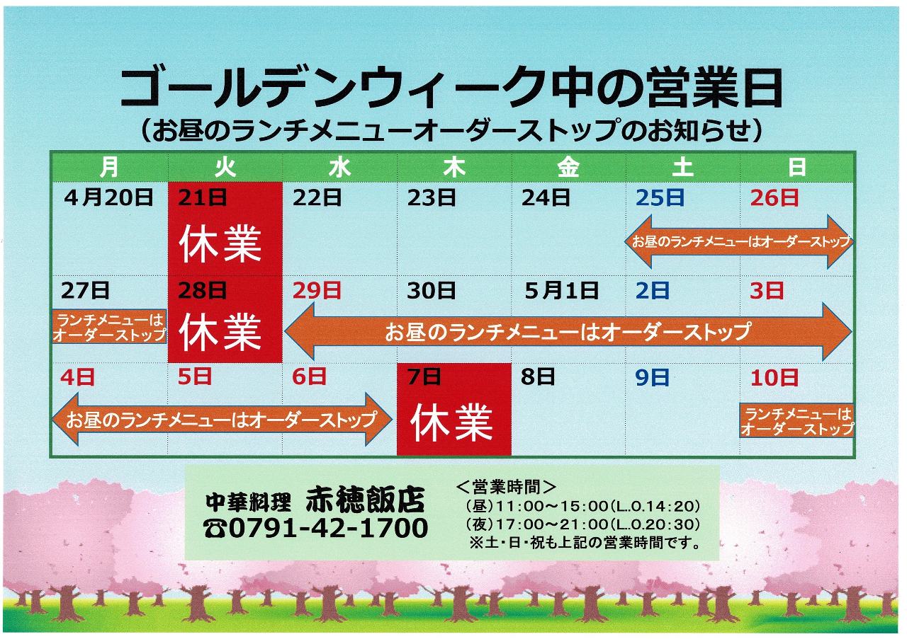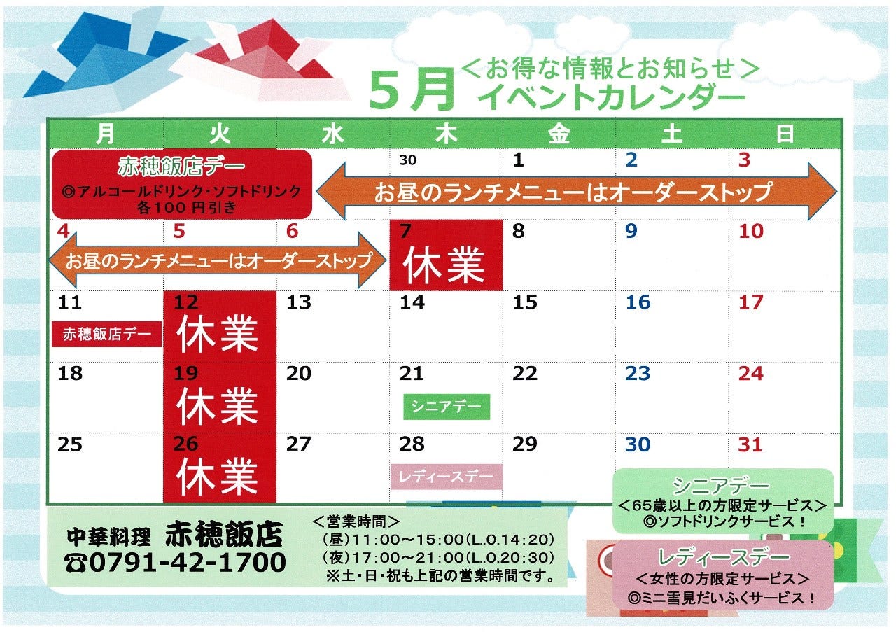 每週星期二 其他(2026年5月7日) ※5月5日無休, 正常營業 |