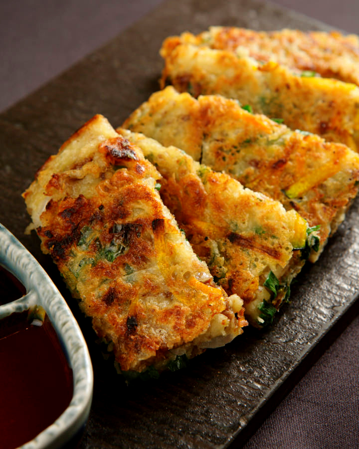 在用水溶解的小麥粉中加入切碎的蔬菜後煎成餅的韓國料理。