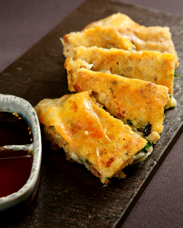 在用水溶解的小麥粉中加入切碎的材料和起司後煎成餅的韓國料理。