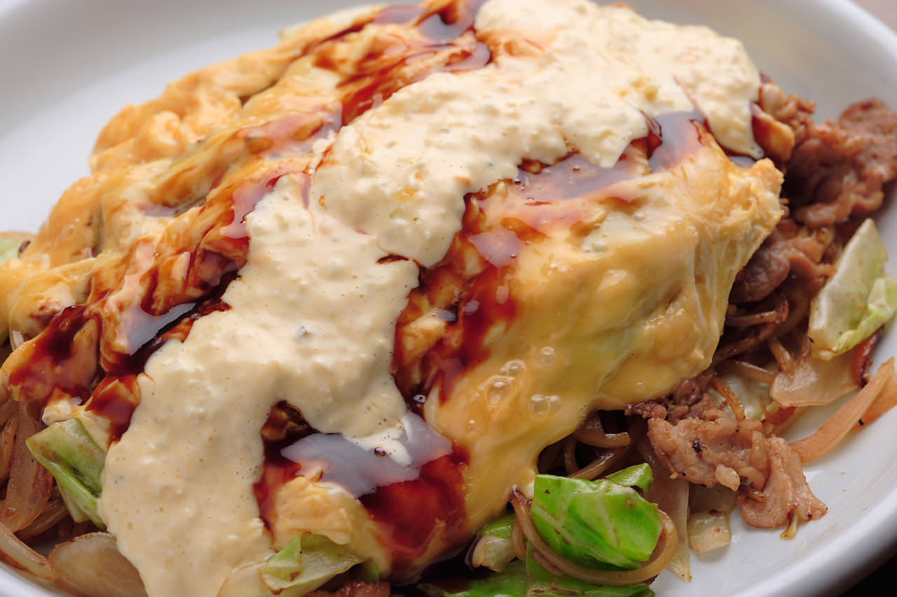 肉,海鮮類和蔬菜炒製後,將面混合再用調味料調味後裹上煎好的薄雞蛋的料理。