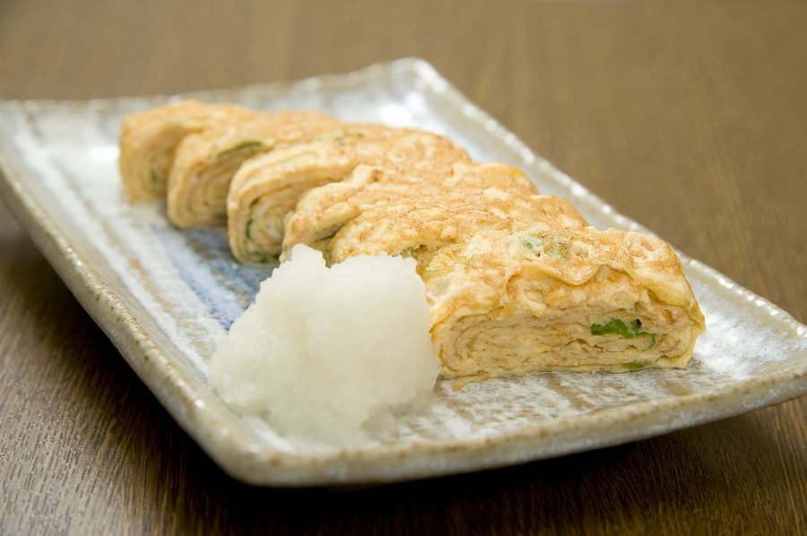 在蛋汁中加入高湯攪拌後,邊煎邊捲、捲得較厚的料理。