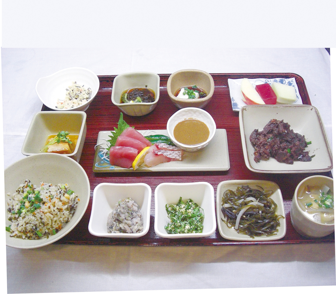 白飯, 豆腐, 豆渣, 豬肉, 花生豆腐, 醋苔, 蘋果, 肉加工品, 海帶絲, 芋頭, 山菜, 木耳, 日本真鱸