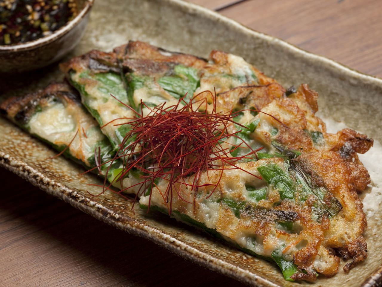 在用水溶解的小麥粉中加入切碎的材料後煎成餅的韓國料理。