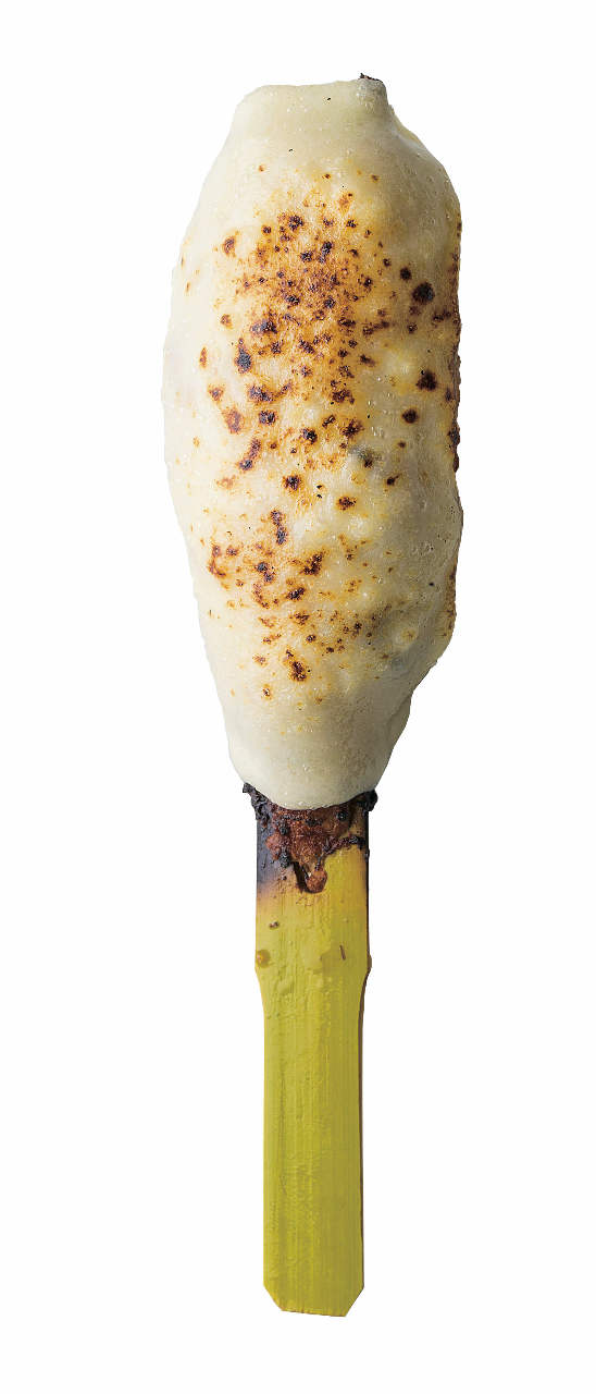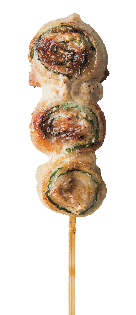 把醃至入味的雞肩胸肉(肩、胸部分很少見的肉)串在竹籤上用火烤。