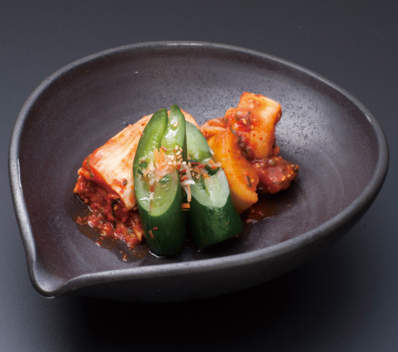 將3種蔬菜與鹽,辣椒,海鮮類鹽辛以及大蒜等一起腌製的拼盤料理。