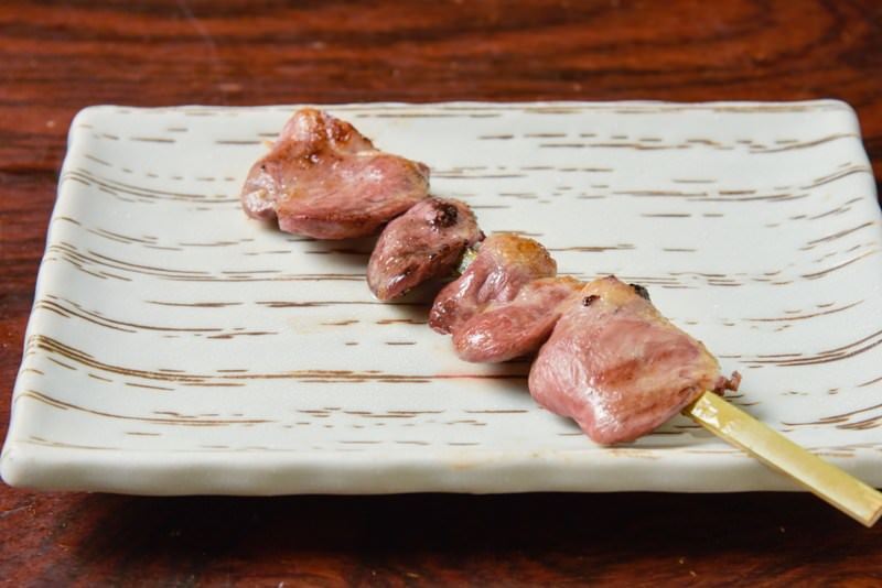 是把已經醃過的雞胗(雞胃的一部分)串成一串,然後以火直接燒烤的料理。