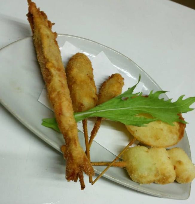 是將各種食材配料串成一串,然後裹上麵衣油炸、材料豐盛的料理。