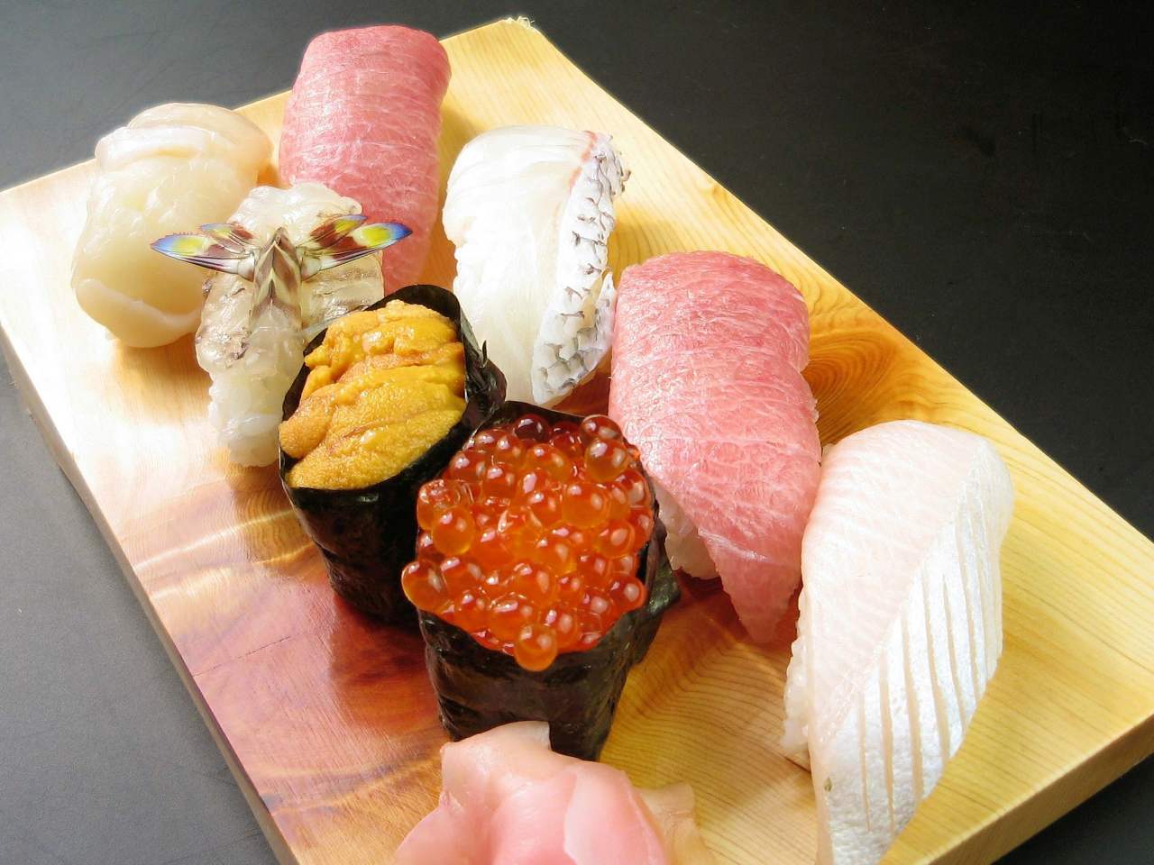 數種將食材擺放於以醋調拌的白飯上,用手捏出的手握壽司的組合。