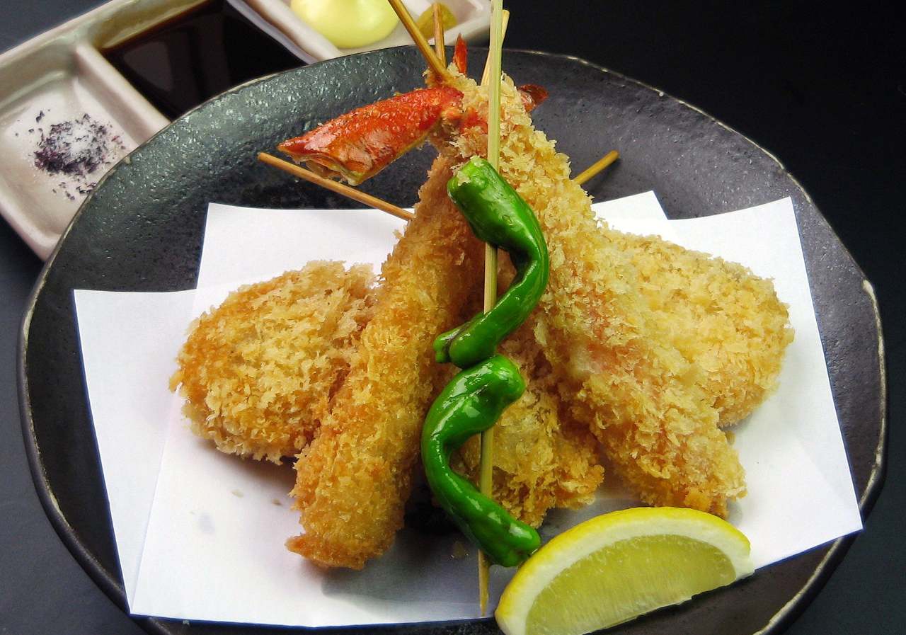 是將肉、海鮮類、蔬菜等串成一串,然後裹上麵衣油炸的料理。