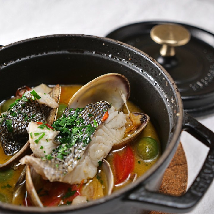 將海鮮,蔬菜用大蒜和橄欖油燉煮的西班牙料理。