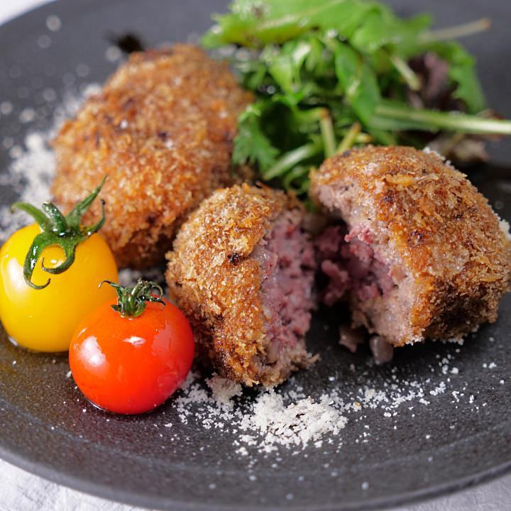 將豬絞肉、牛絞肉、及洋蔥混合後裹上麵糊去油炸的料理。