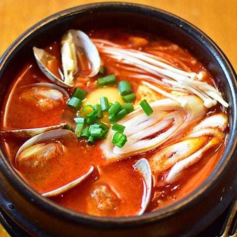 在辛辣的高湯裡放入午餐肉和香腸等食材一起用鍋燉煮而成的料理。