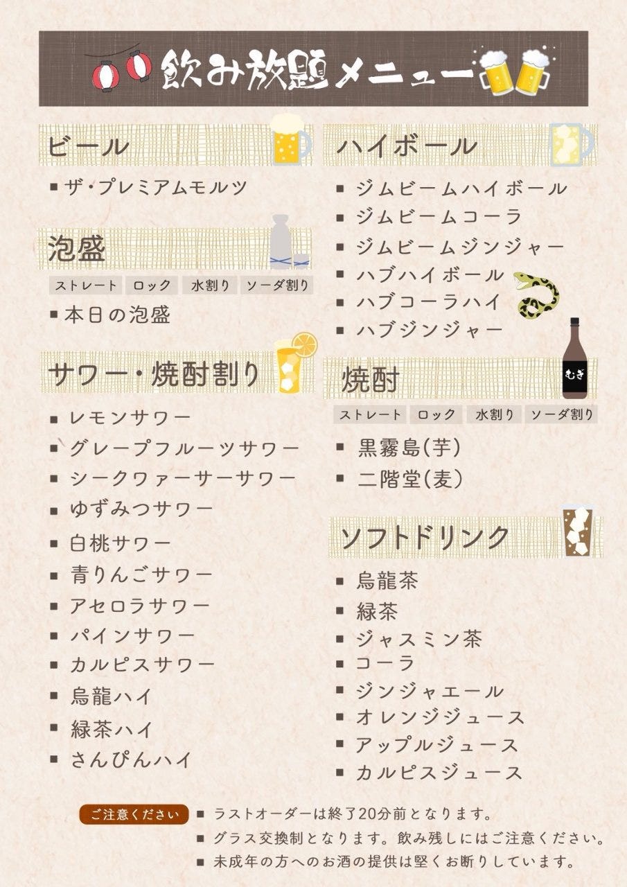 星期五/星期六/假日前一天 晚餐時段:18:00~下個1:00(L.O.23:45, 酒水L.O.24:00)
