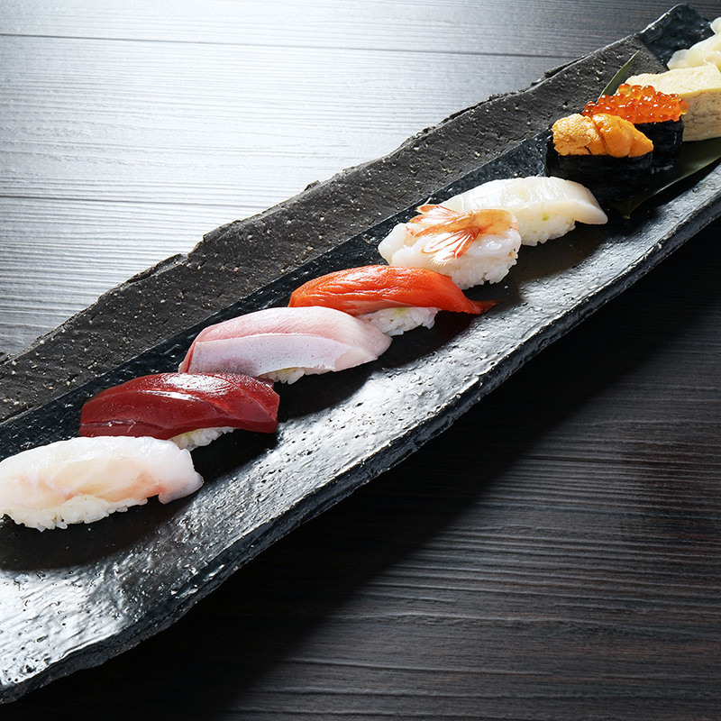 醋飯, 黑鮪魚, 海膽, 牡丹蝦, 鮭魚卵, 扇貝, 白肉魚, 青魚(背部為青色的魚之統稱), 貝類