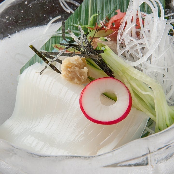 把鮮黑鮪魚大脂部分的魚身切成薄片,蘸醬油等食用。