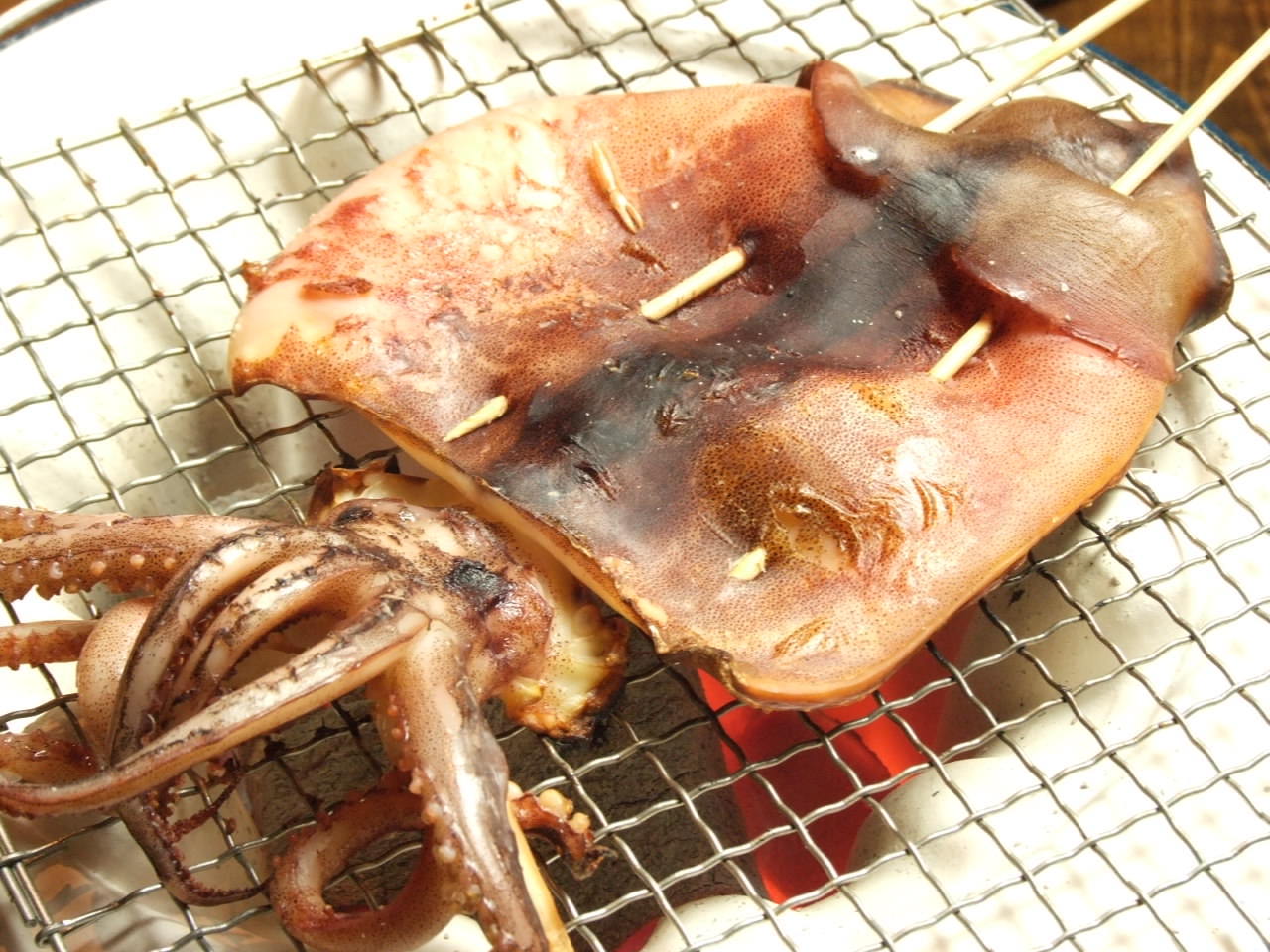 用調味料醃好味道後將整隻花枝拿去烤的料理。