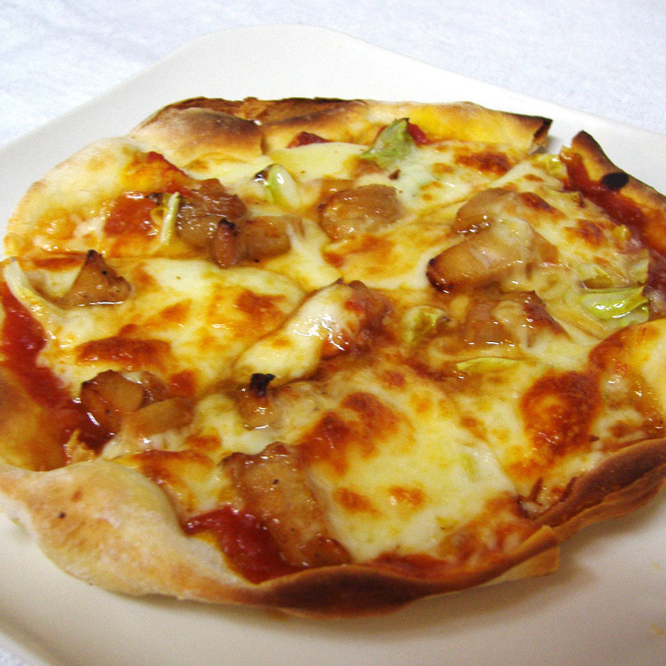 在披薩上放上用醬油甜味醬汁入味的雞肉後烤製的料理。