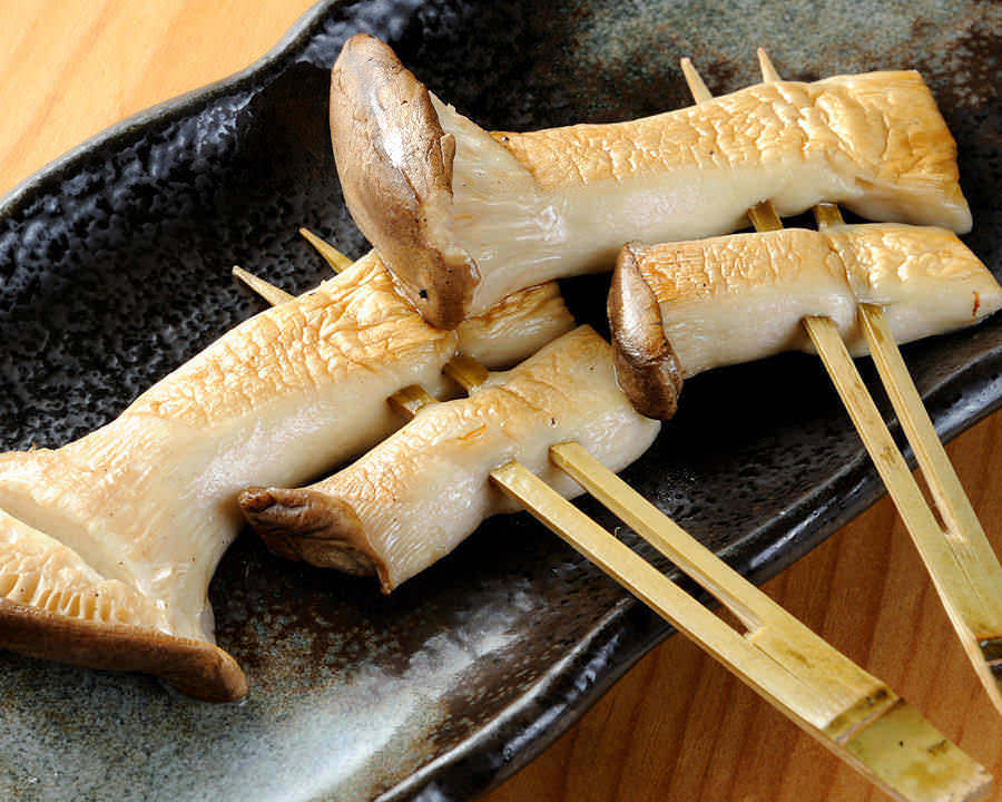 一口大小的杏鮑菇串成烤串,直接用火烤製而成的料理。