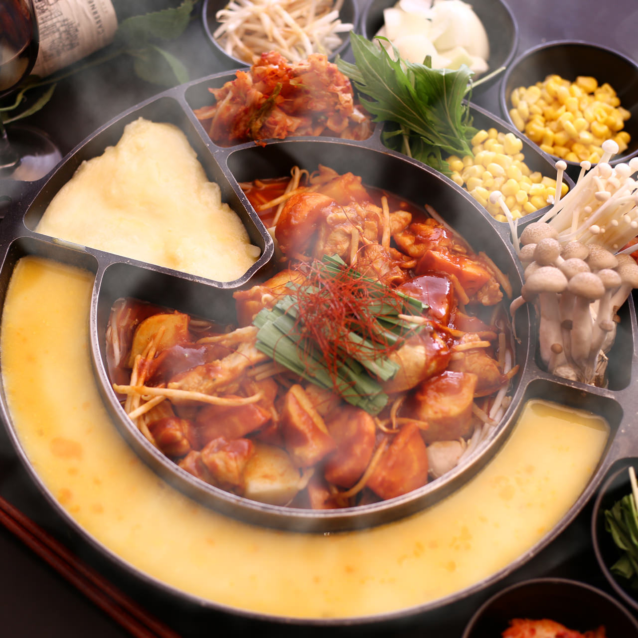 將雞肉和蔬菜用韓國紅辣椒醬基調的醬汁入味炒製,與在鐵板上融化的起司混合食用的料理。