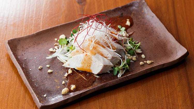 用碗裝的飯蓋上烤雞肉的料理。