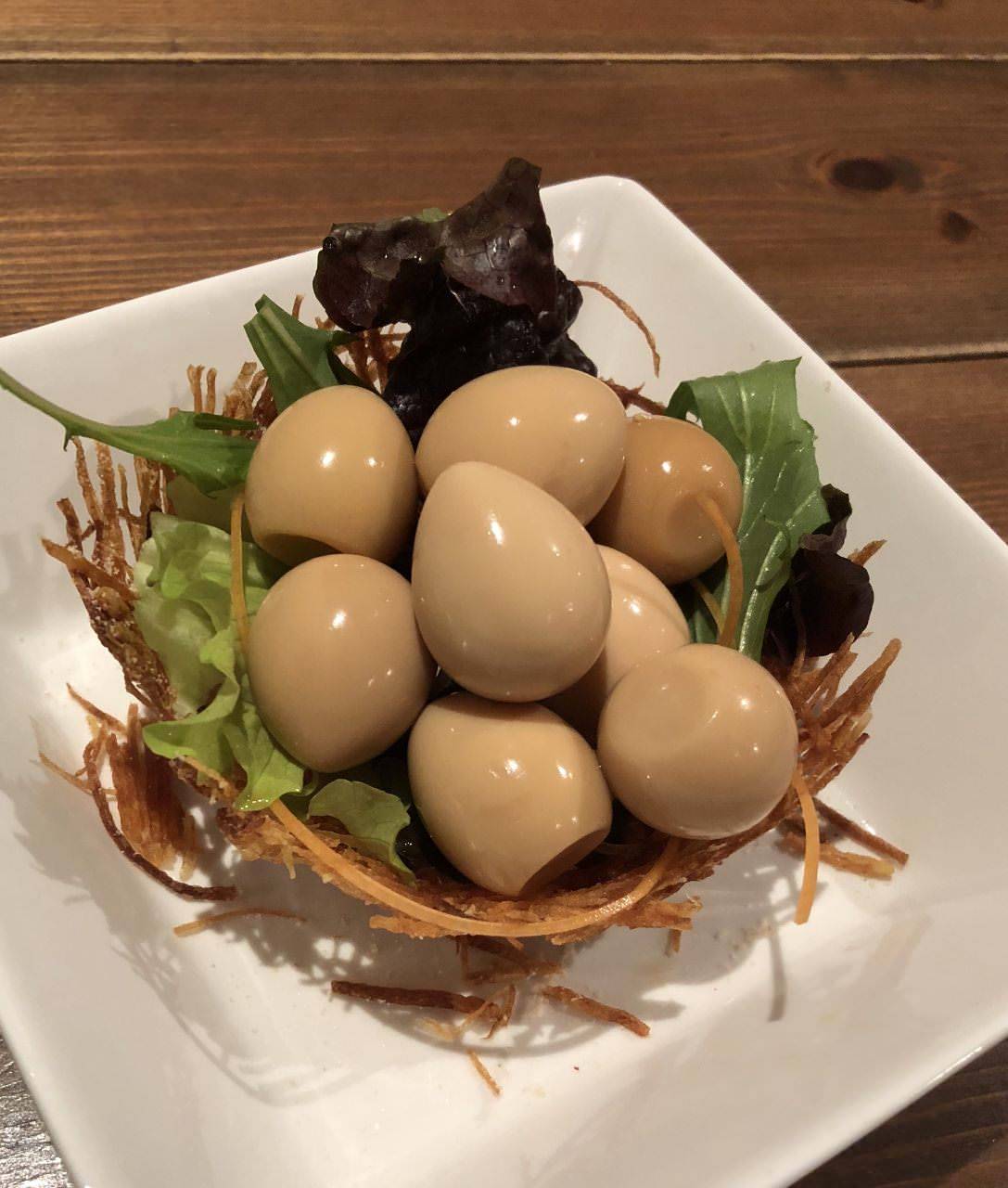 將鵪鶉蛋用木材高溫加熱時產生的煙,熏製而成的風味料理。