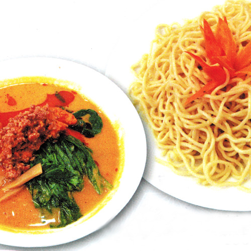 在湯裡放入麵條,用醋和香料入味後再放上炒肉和炒蔬菜的料理。
