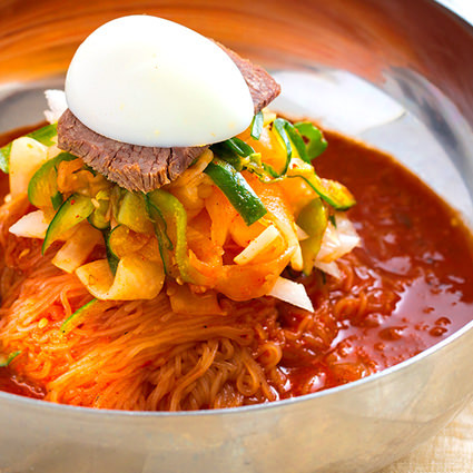 在涼麵上放上切細的黃瓜和煮雞蛋,再澆上韓國紅辣椒醬等醬汁的料理。