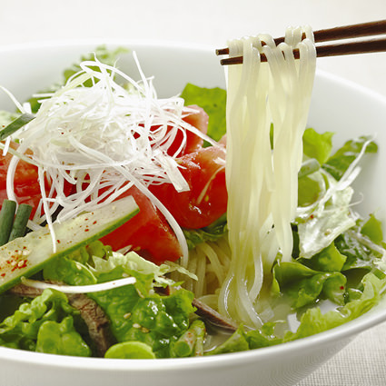 在冰冰涼的湯裡放入用蕎麥麺粉等製作的麺條,再搭配肉和蔬菜的料理。